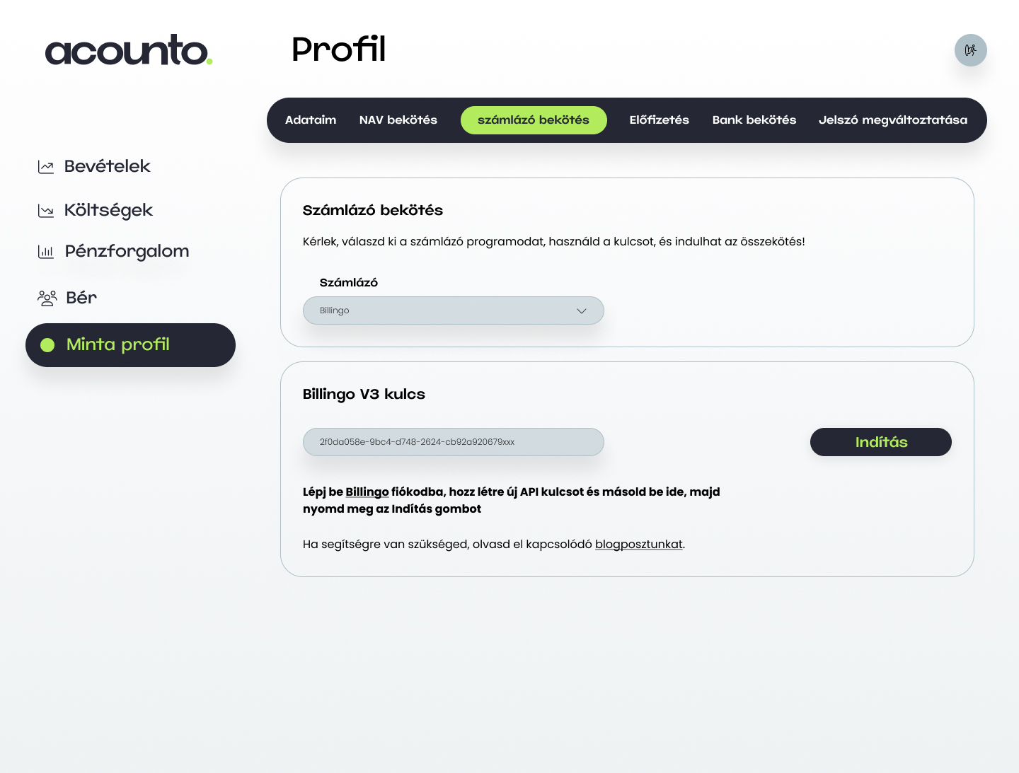 Ezek után tedd vágólapra a létrehozott Billingo API kulcsot, majd írd be Acounto fiókodban a profilodon található mezőbe!