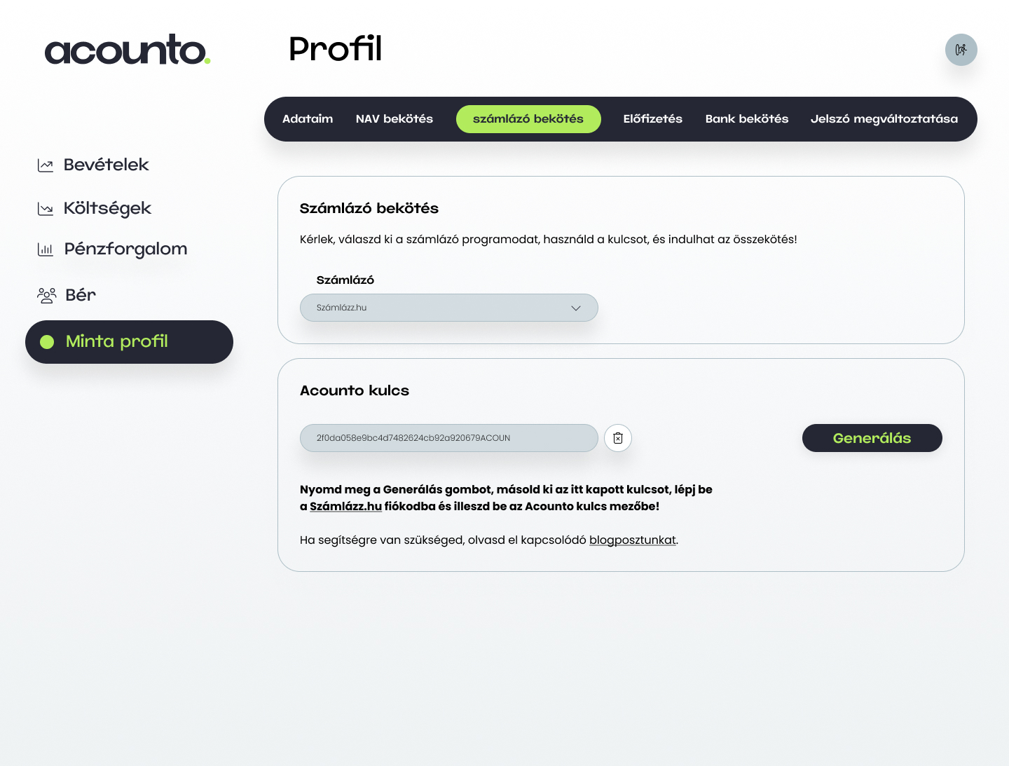 Az Acounto profilodon válaszd ki a számlázó bekötésnél válaszd ki a számlázz.hu-t, majd nyomd meg a Generálás gombot! A létrehozott kulcsot másold a vágólapra!