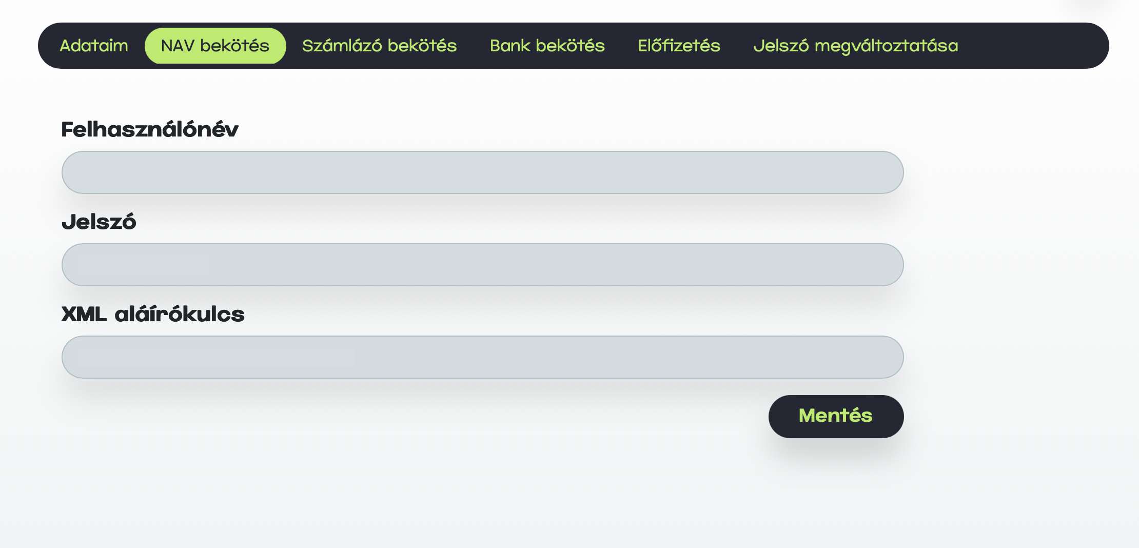 Az Acountoba való belépés után a fiókbeállításokhoz lépve másold be a technikai felhasználót, a jelszót, valamint a két létrehozott kulcsot és kattints a Mentés gombra!